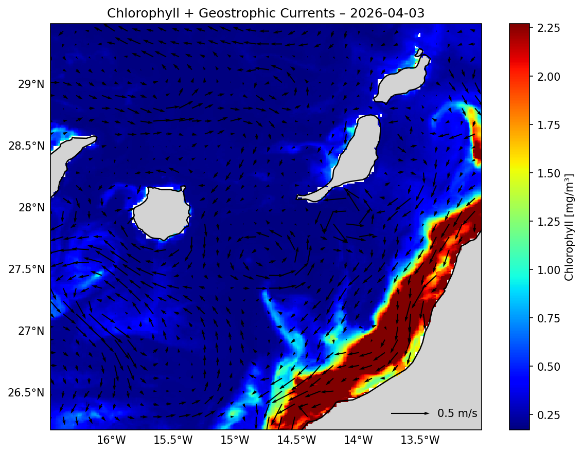 Chlorophyll concentration and geostrophic currents Chlorophyll-a concentration as a proxy for phytoplankton biomass, indicating primary productivity and potential feeding grounds.