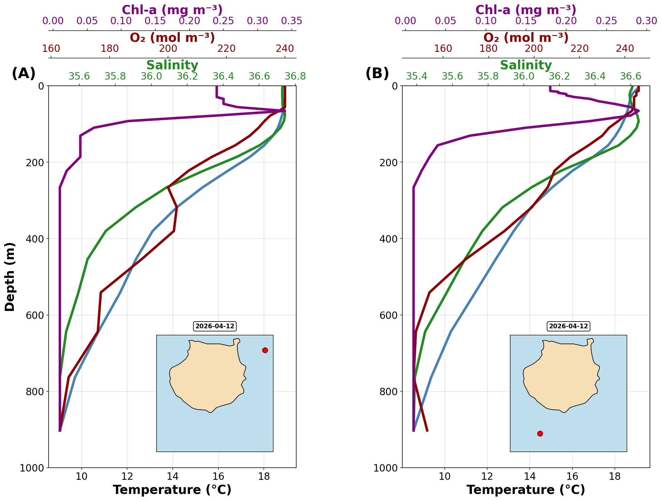Vertical profiles at sampling locations Vertical profiles of physical and biogeochemical variables describing water column structure and habitat conditions for pelagic organisms. Two points are shown, one east of the island and another south of it, representing potential sampling locations.