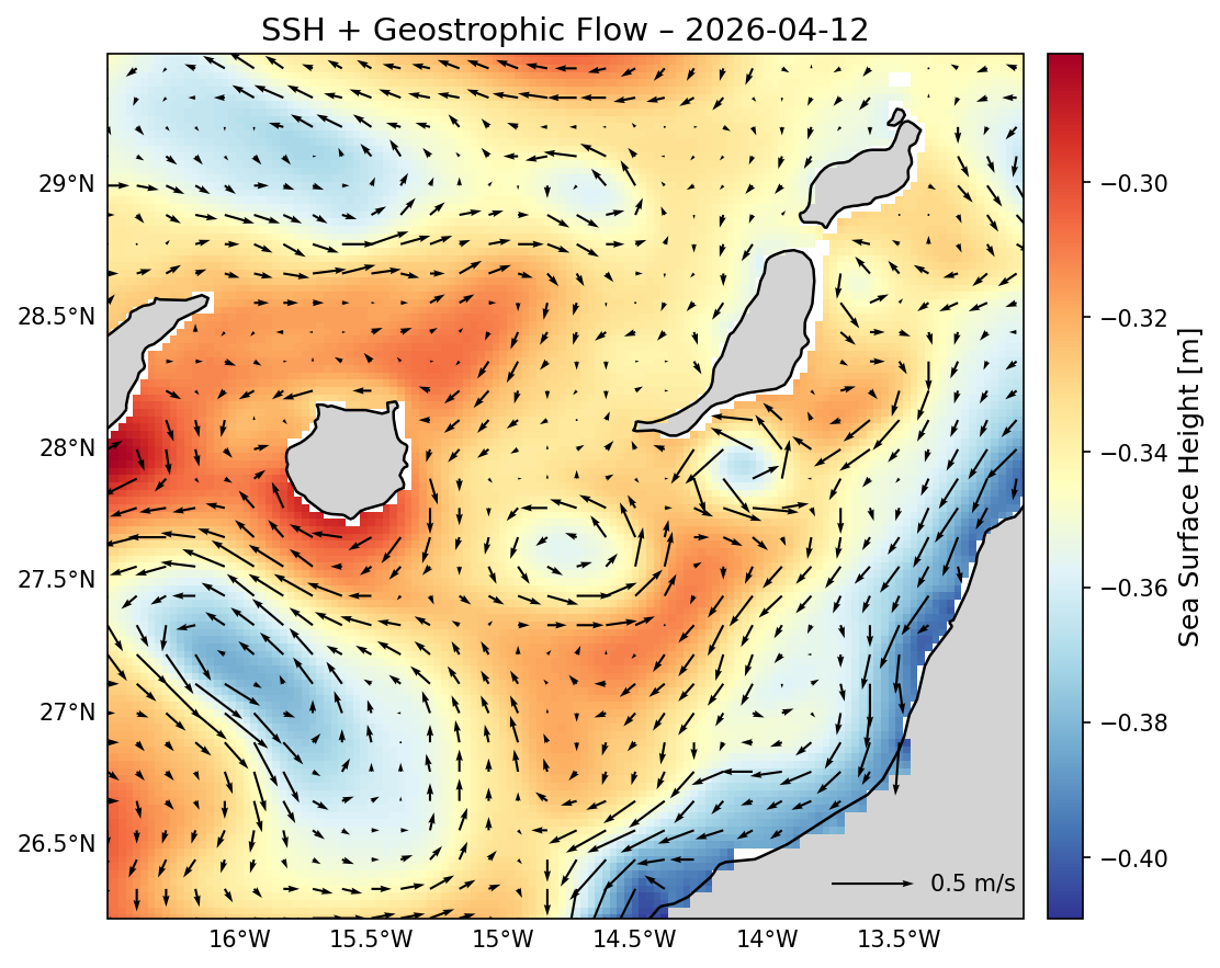 Sea Surface Height and geostrophic circulation Sea surface height anomalies and derived geostrophic flow revealing mesoscale structures such as eddies and fronts affecting ecosystem variability.