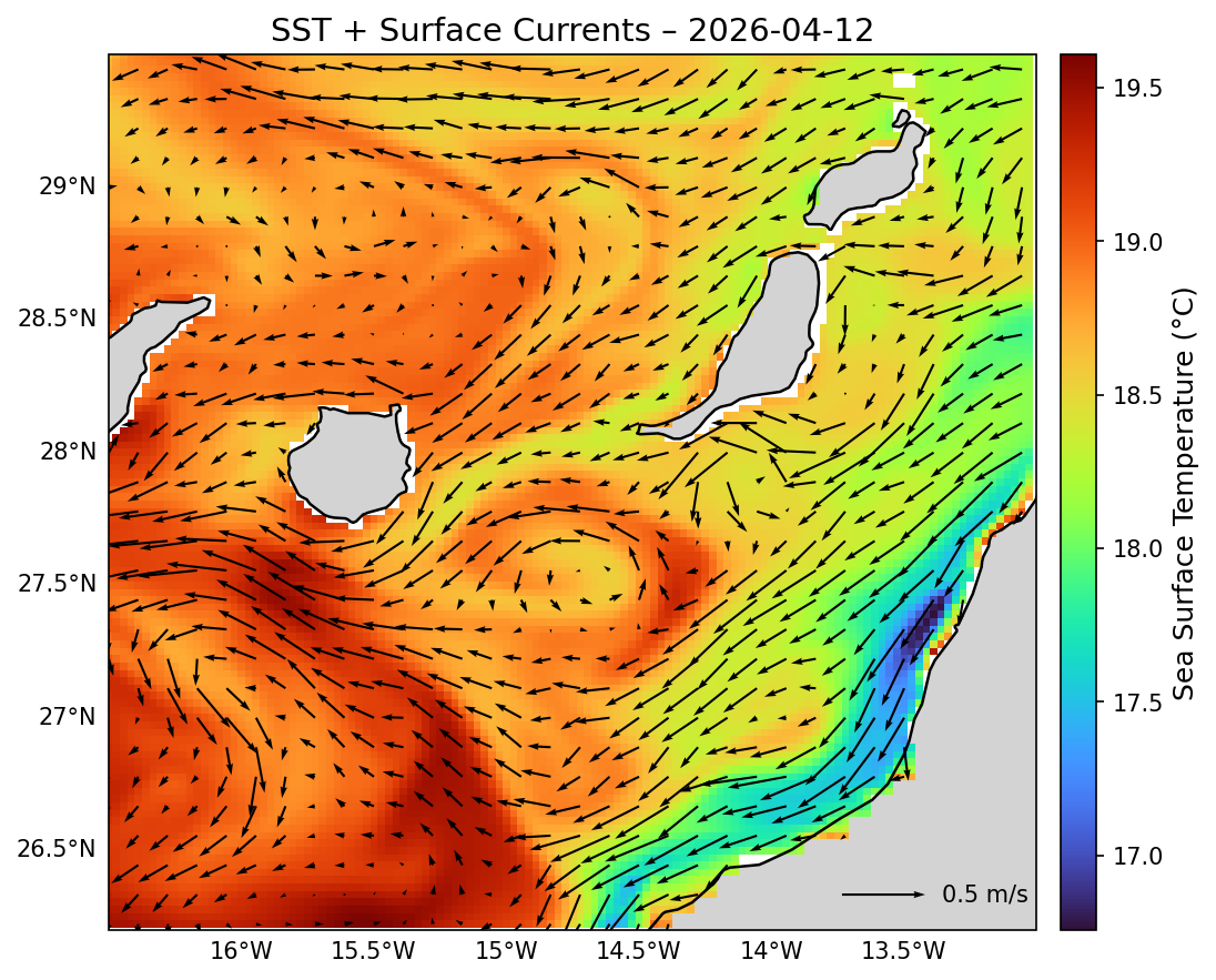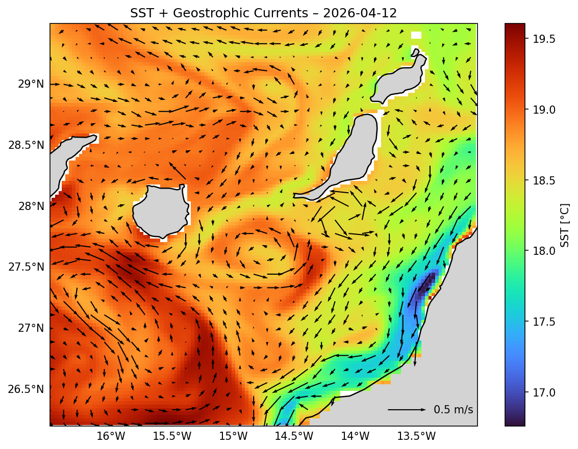 Sea Surface Temperature and geostrophic currents Sea surface temperature combined with geostrophic circulation derived from satellite altimetry, highlighting mesoscale ocean dynamics.