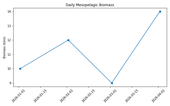 Estimated daily biomass of mesopelagic fishes Estimated mesopelagic fish biomass derived from acoustic or modeled micronekton distributions, showing temporal variability in deep pelagic communities.