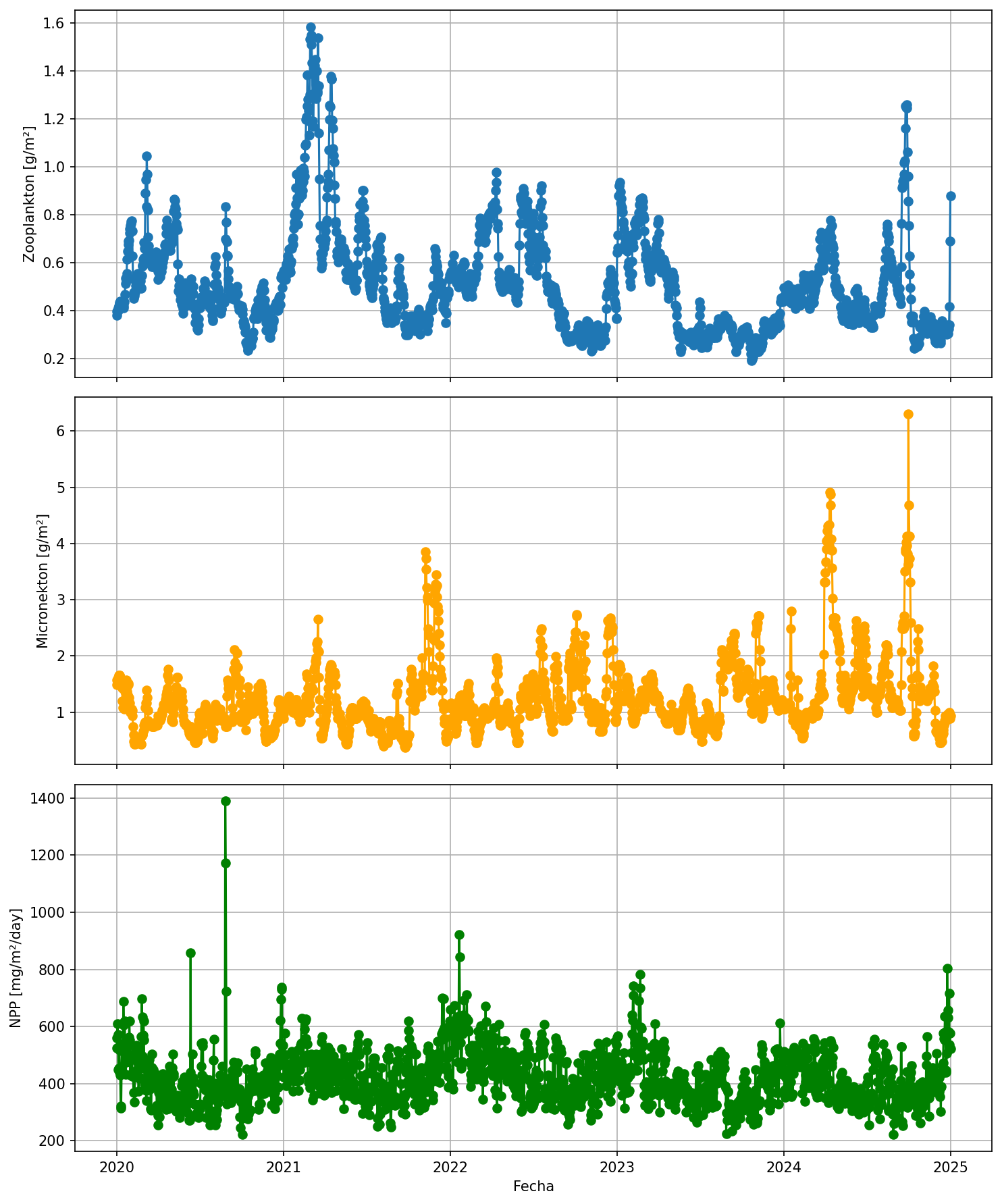 Temporal series of zooplankton, micronekton, and NPP Time series of biogeochemical and micronekton variables used to examine environmental variability and potential drivers of mesopelagic ecosystem dynamics.
